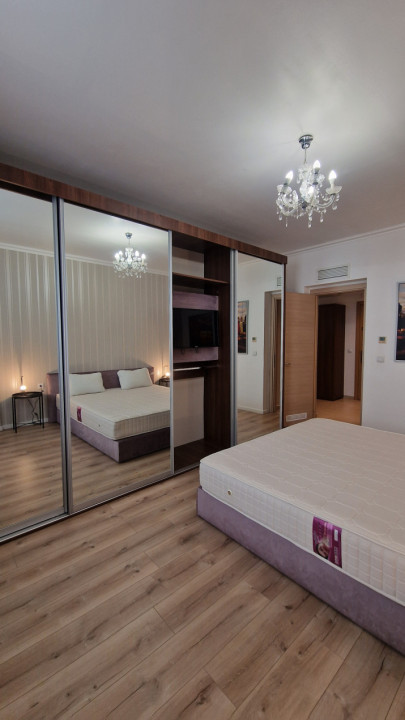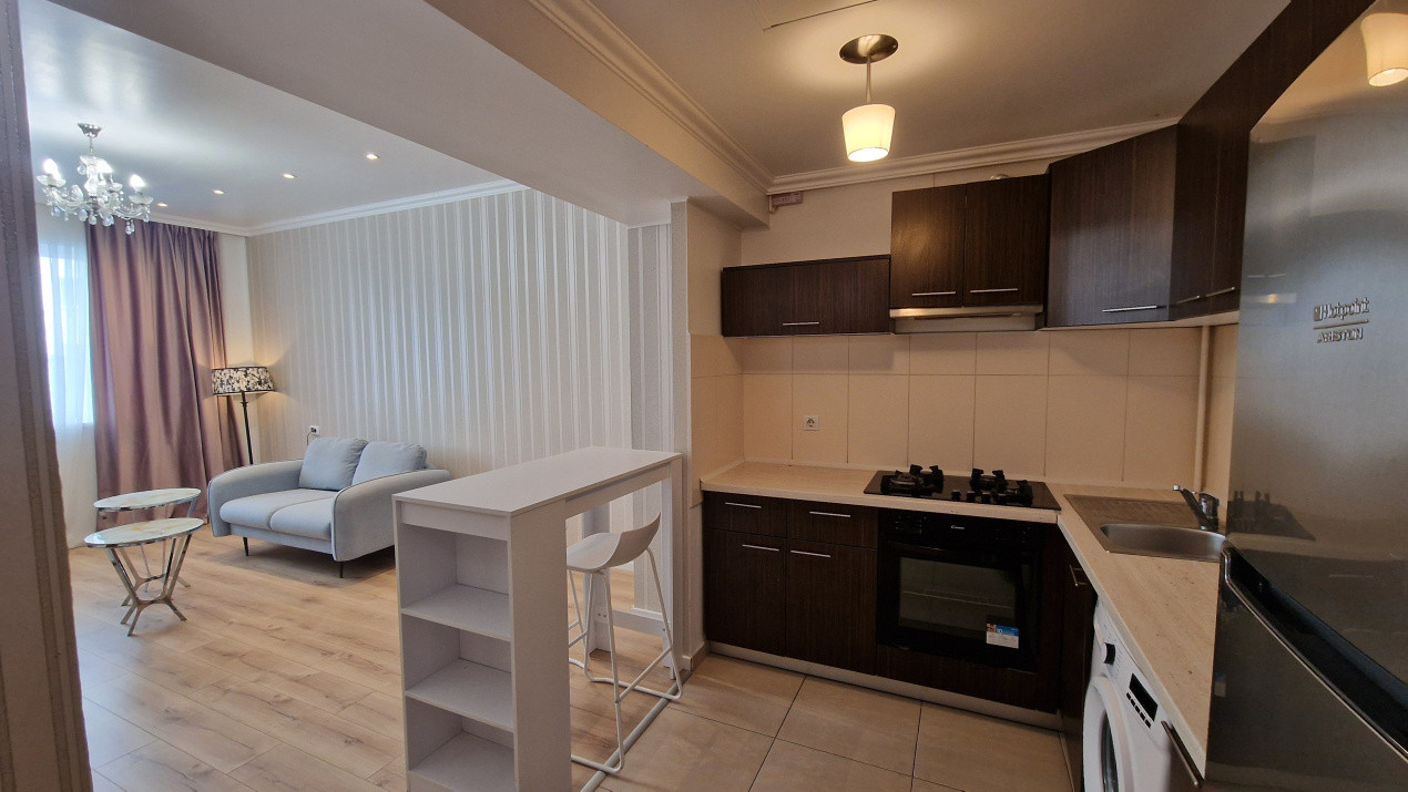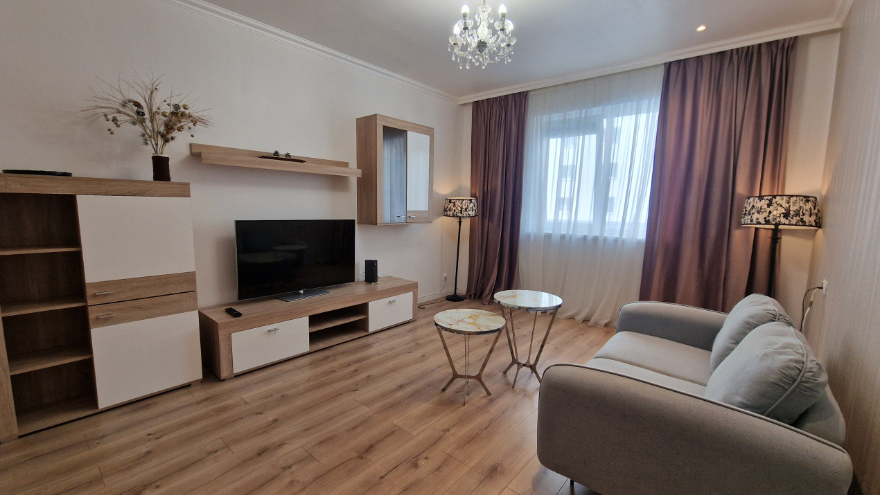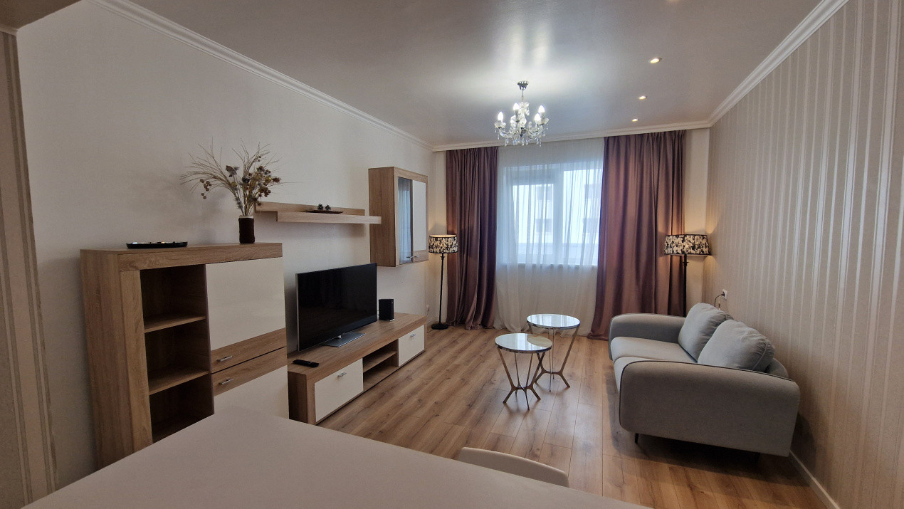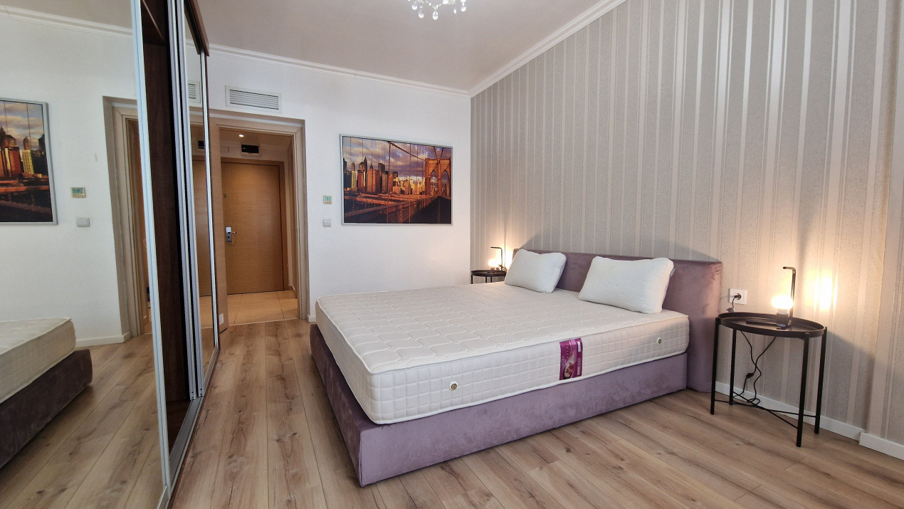 Locuința este amplasată la etajul 3 din 13 și beneficiază de o priveliște deschisă, lumină naturală și un nivel ridicat de intimitate. Apartamentul se inchiriaza complet mobilat și utilat, cu electrocasnice și piese de mobilier de calitate superioară, fiind gata pentru mutare imediată. Compartimentarea este bine gândită: hol generos dotat cu dressing, baie modernă cu cadă, mașină de spălat cu uscător și uscător de păr, dormitor matrimonial confortabil, prevăzut cu pat, saltea premium, perdele și draperii noi, plus un Smart TV de 140 cm cu Netflix. Bucătăria open space este complet echipată și se îmbină armonios cu livingul, creând un spațiu primitor ideal pentru relaxare.