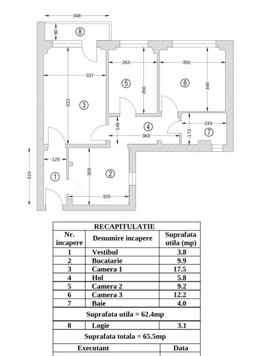 - Compartimentare: cameră principală (17,5 mp), bucătărie separată (9,9 mp), dormitoare 9,2 mp şi 12,2 mp, hol + vestibul (9,6 mp)