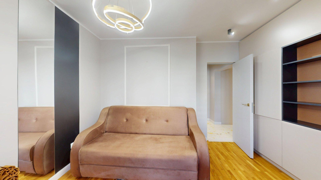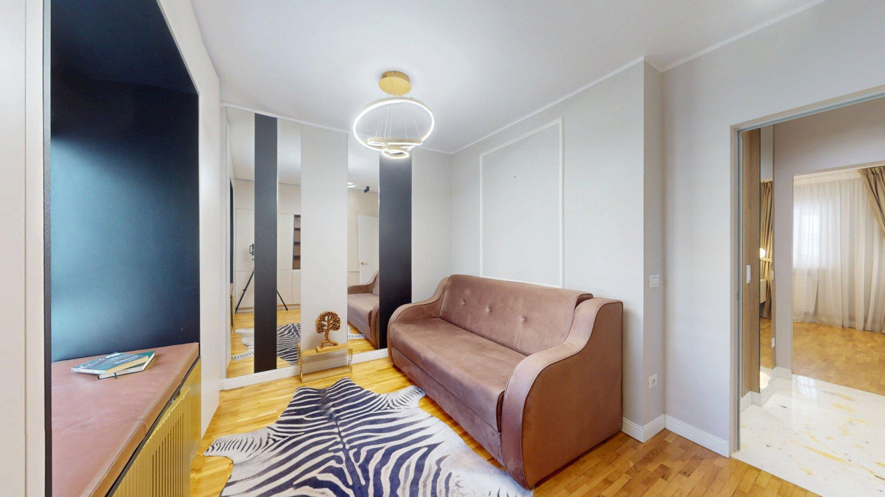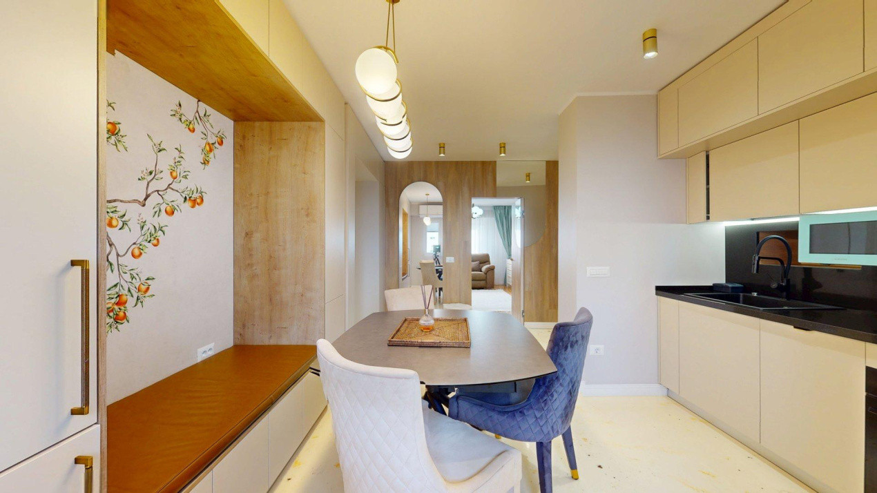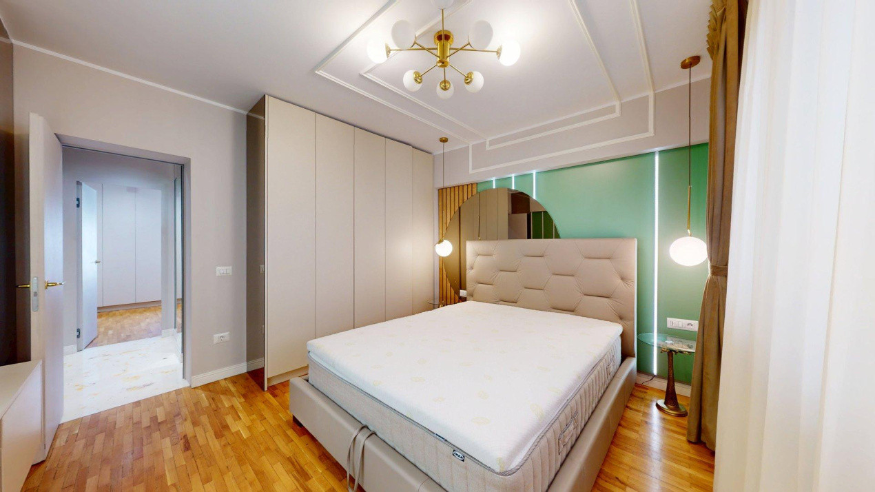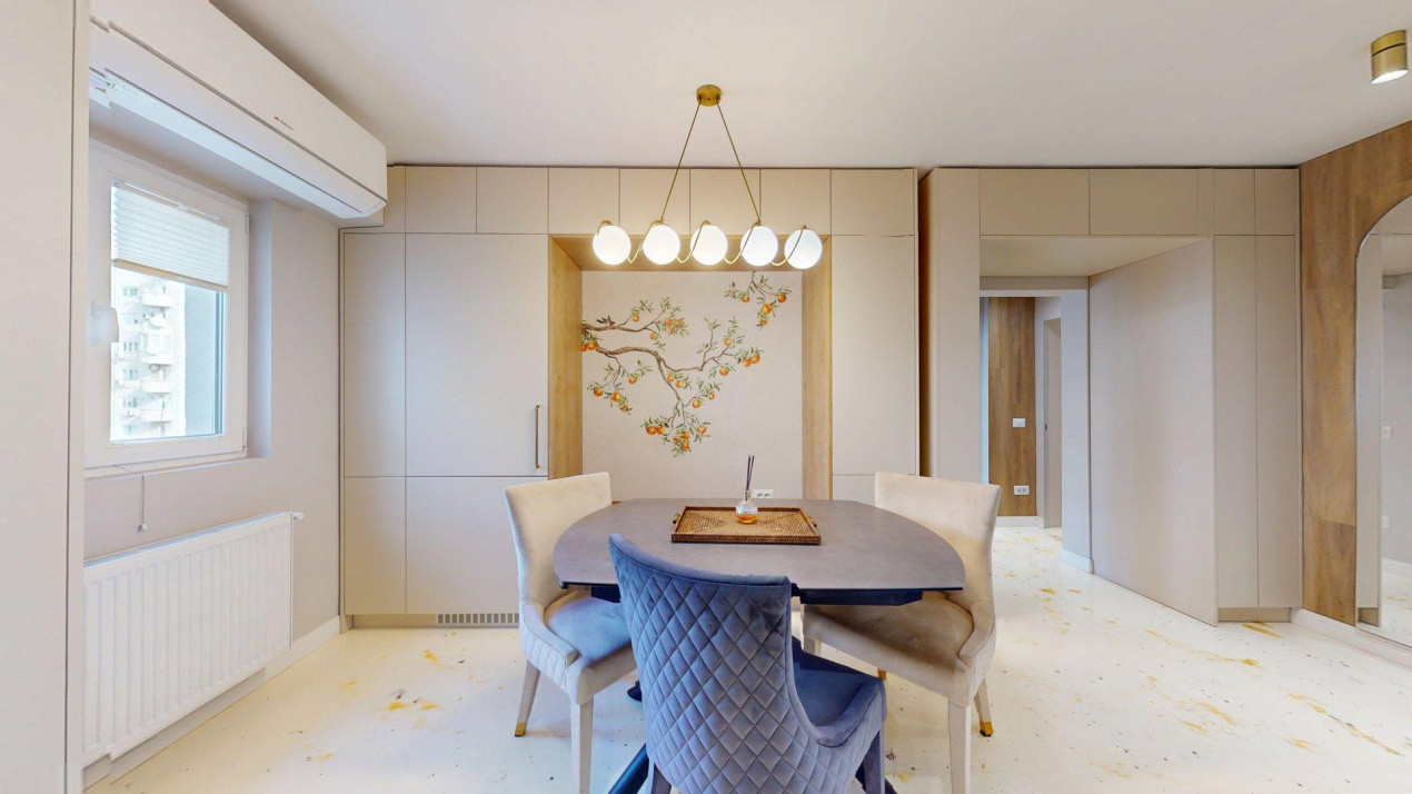 Un spațiu în care fiecare detaliu a fost ales cu grijă, de la tapetele pictate manual în Italia, până la luminile calde care se reflectă în texturile nobile. Totul este nou, impecabil, pregătit să devină acasă pentru cineva care caută frumosul.