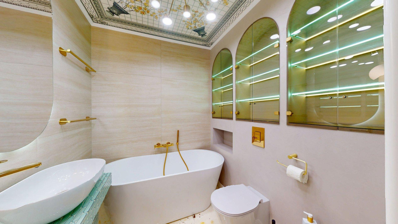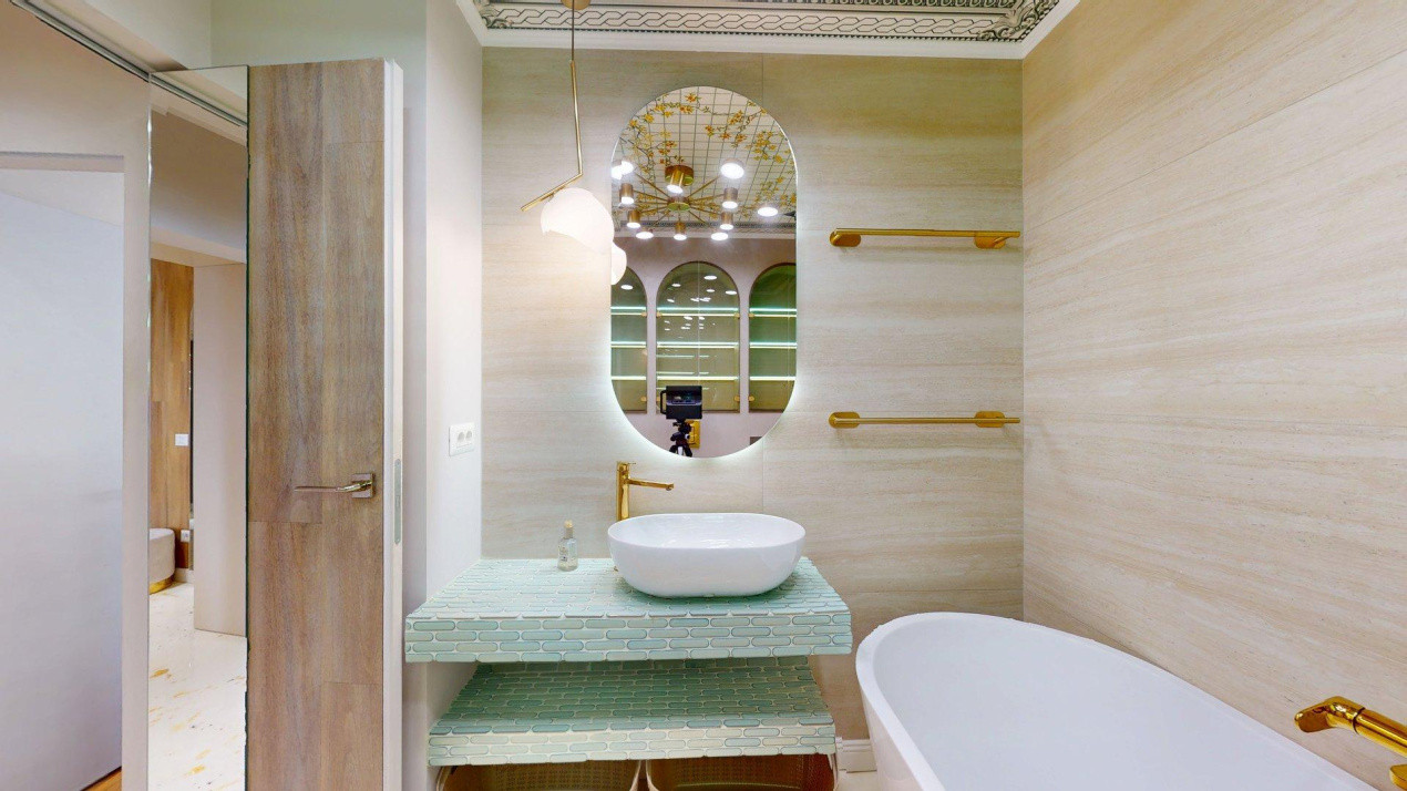 O baie premiată în Germania, cu obiecte sanitare de excepție și un tapet pictat manual care transformă rutina într-un ritual de răsfăț.