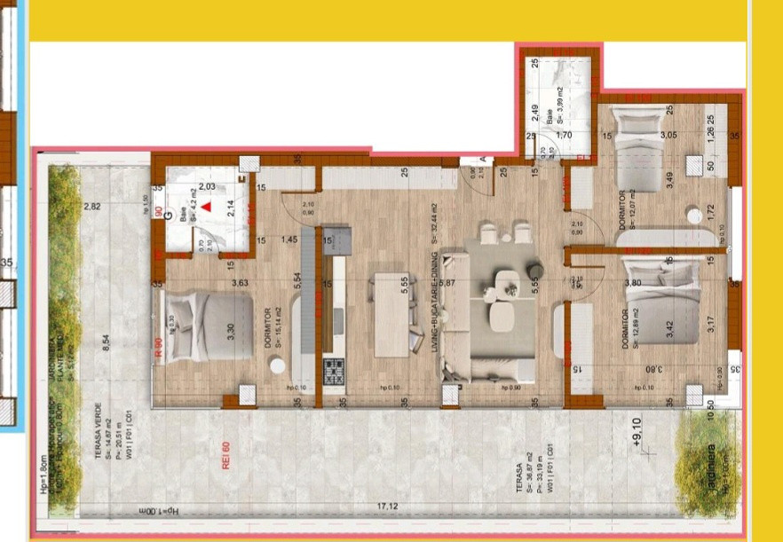Apartamentul prezentat este de 4 camere, are o suprafata utila de 106 mp, iar punctul forte este cu siguranta terasa de 50 mp. Zona de zi este compusa din living, bucatarie deschisa si acces catre terasa, unde se poate amenaja o zona de relaxare.