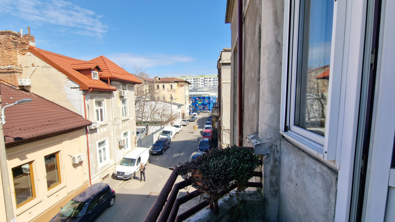 Etaj (106 mp): Sală de conferințe, birouri directoriale și balcon cu vedere spre zona istorică.